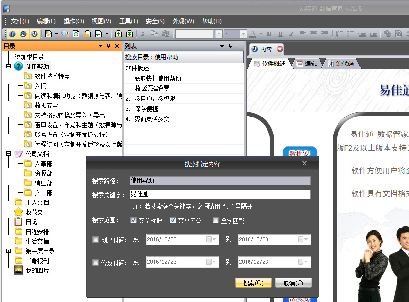 在目录窗口选定指定目录,然后打开右键菜单,可按指定条件搜索目录中符合搜索条件的文章,如图。 若我们在目录窗口选择”添加根目录“,然后打开右键菜单进行搜索,则对当前账号的所有文章进行搜索。
