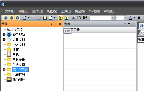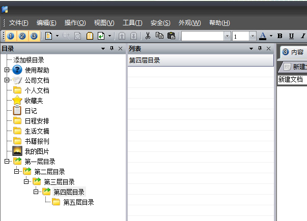 创建目录需要在文章浏览模式下进行,我们打开目录窗口的右键菜单,使用“新建目录”,即可创建新目录。如图,我们创建了一个的5层目录,依此类推,软件支持创建目录的深度最多为20层,足以满足用户的需求。