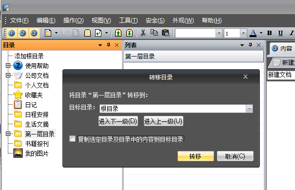 我们打开目录窗口的右键菜单,执行“转移目录”操作,可以将选定目录转移或复制到目录的其它位置(转移或复制目录时,其下的文章和文件也一同被转移或复制)。