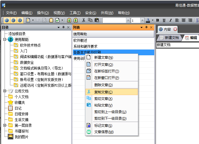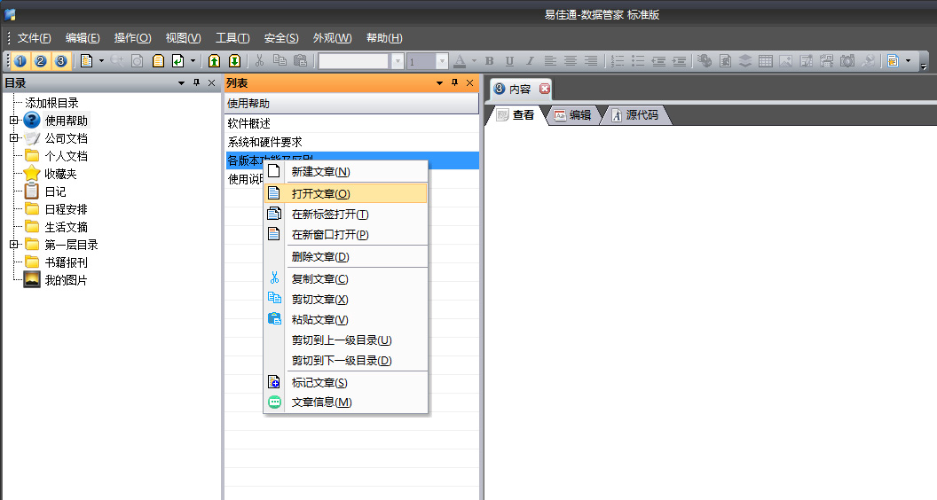 我们在列表窗口打开右键菜单,若选择“打开文章"(也可直接双击选定的文章),则文章会在默认标签中打开(查看标签);若选择“在新标签打开”,则文章会在内容窗口中创建新标签并打开文章;若选择“在新窗口打开”,则文章会在新建窗口中打开。