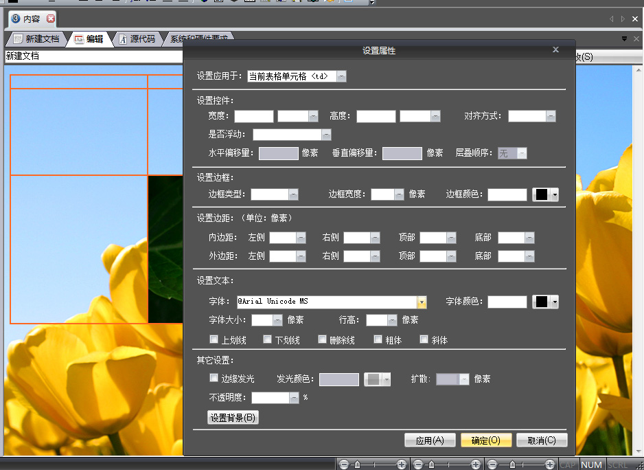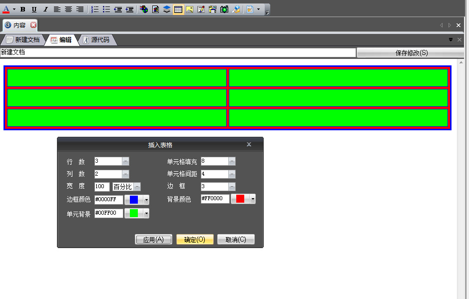 我们可以通过使用编辑标签右键菜单中的“插入表格”完成此操作,如图,用户配置好表格信息后,可以点击“应用”来预览插入效果,完成后点击“确定”完成插入,若点击“取消”则取消表格插入。 表格插入完成后我们可以通过拖动表格边框或表格单元格的边框来改变表格的尺寸和形状。
