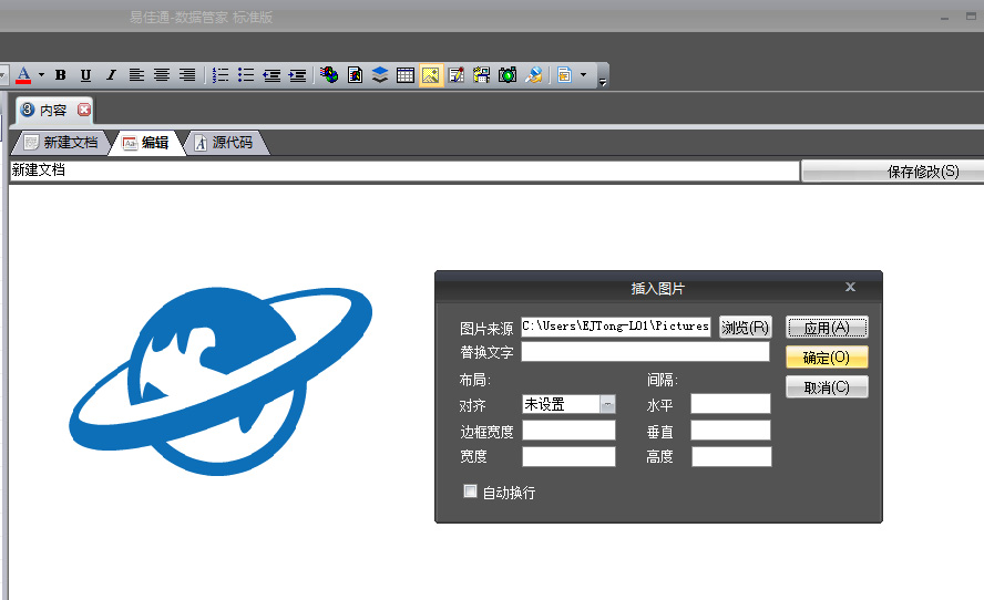我们可以通过使用编辑标签右键菜单中的“插入图片”,在编辑器中插入图片,允许插入的图片格式包括jpg、bmp、gif、png、ico文件;我们也可以将网页或word文档中的图片直接复制后,粘贴到编辑器中。 文章编辑完成后,点击“保存修改”后,我们插入的图片会自动保存到软件数据库中;文章再次打开时会自动载入软件数据库中保存的图片,而不是原图片链接。 用户也可以使用主菜单->编辑->批量导入(导出)文件->批量插入图片,一次性在编辑器中插入多张图片。(免费版不支持此功能)