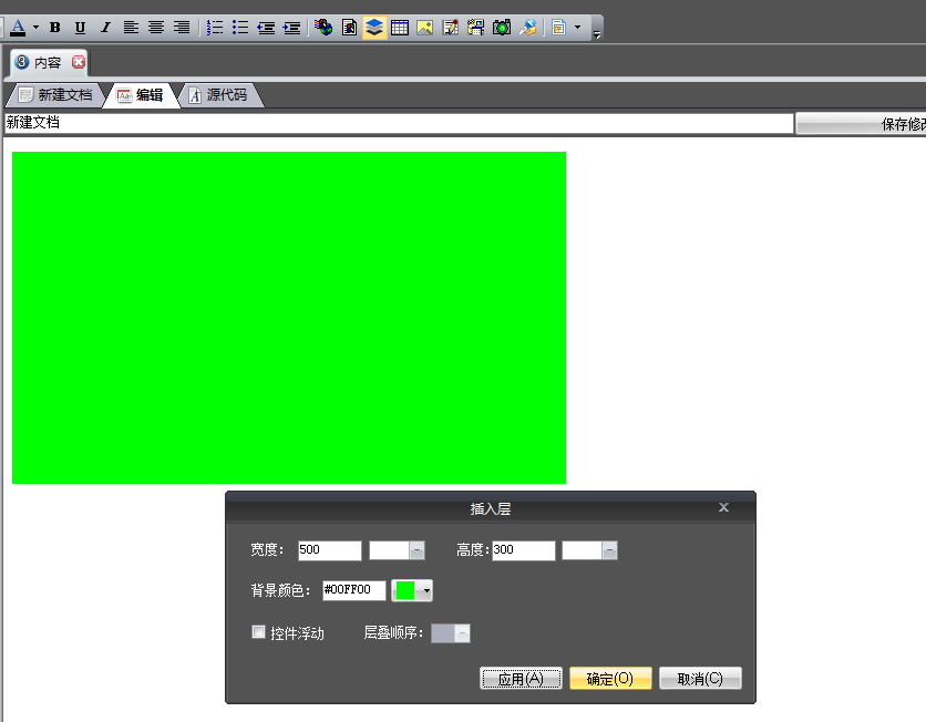 我们可以通过使用编辑标签右键菜单中的“插入层”,在编辑器中插入层控件(div),如图,若勾选控件浮动,则此层不受排版约束,可以使用“设置属性”功能随意调整层在文章中的位置。 插入层后,我们可以在层中进行其它的编辑操作。 层叠顺序表示若编辑器中有两个层发生重叠时,层叠顺序高的层会覆盖层叠顺序低的层的重叠部分。