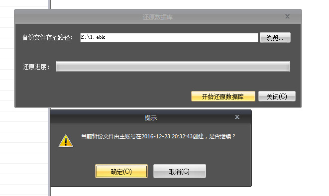 执行主菜单->工具->数据维护->还原数据库,选择指定的数据库备份文件,可以将数据还原,还原数据库后会覆盖软件的整个数据库(即覆盖所有账号的数据),并非只覆盖当前账号的数据。 只有当前软件的数据库备份文件可以在软件中执行数据库还原,其它版本或其它序列号的数据管家数据库备份文件无法在当前软件中还原,即当前序列号软件只能还原当前序列号软件的备份文件。 对于数据管家定制开发版,只有主账号或管理员才有权限还原数据库。备份和还原数据库操作都必须在本地操作,不允许远程操作。