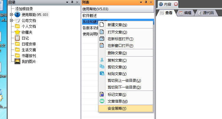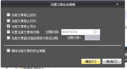 在列表窗口选定指定文章后,打开右键菜单,选择“安全策略”,可以设置文章的安全策略。 我们勾选“当前文章禁止导出",点击“确定”后,则我们无法将此文章导出为Html或文本文件。