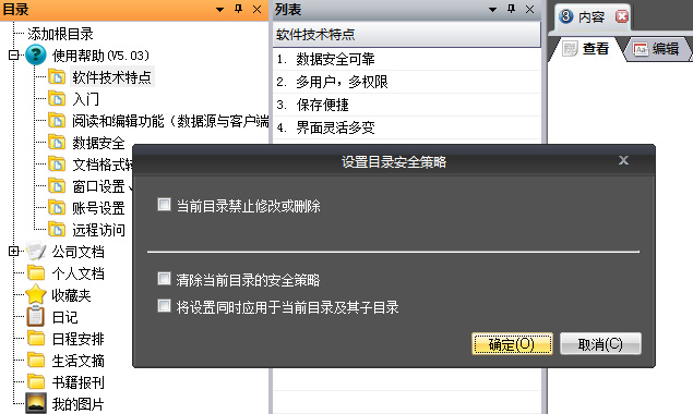 在目录窗口选定指定目录后,打开右键菜单,选择“安全策略”,可以设置目录禁止修改或删除。 若勾选“将设置同时应用于当前目录及其子目录”,则安全策略会应用于其下所有目录,否则只应用于当前目录。 若勾选“清除当前目录的安全策略”,点击“确定”后会删除当前目录的安全策略。