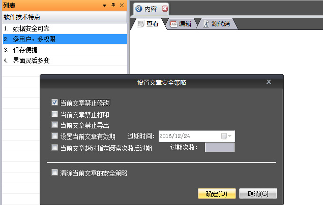 在列表窗口选定指定文章后,打开右键菜单,选择“安全策略”,可以设置文章的安全策略。 我们勾选“当前文章禁止修改",点击“确定”后,则当前文章无法以删除文章的方式删除。(但若删除当前文章所在的目录,则此文章也会被删除;我们可以同时设置文章所在目录禁止删除,来彻底禁止删除当前文章) 若我们编辑此文章,点击“保存修改”时,会提示没有权限修改此文章。