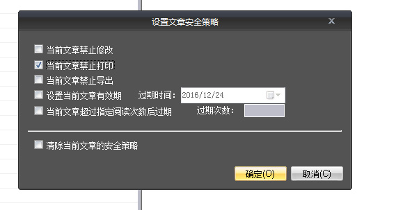 在列表窗口选定指定文章后,打开右键菜单,选择“安全策略”,可以设置文章的安全策略。 我们勾选“当前文章禁止打印",点击“确定”后,则当前文章无法进行打印。