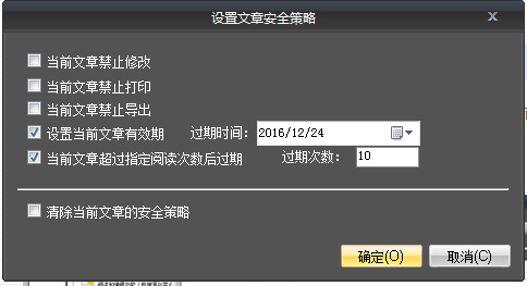 若我们勾选“设置当前文章有效期”,则时间超过过期时间后,打开文章时会提示文章过期,无法打开。 若我们勾选“当前文章超过指定阅读次数后过期”,则文章浏览次数超过过期次数时会提示文章过期,无法打开。 可在列表窗口选定文章后,打开右键菜单,点击“文章信息”,来查看当前文章的安全策略和浏览次数。