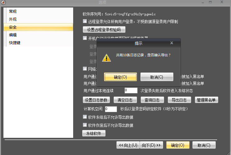 我们以管理员身份登录数据管家定制版,打开主菜单->工具->选项->安全,点击“导出日志”,可将软件内所有操作日志导出为文本文件。